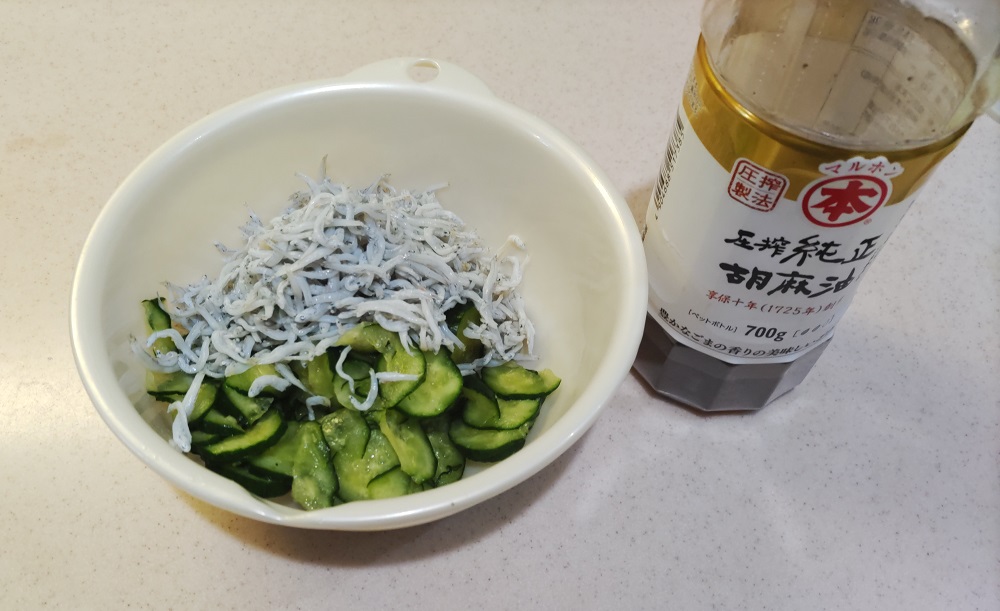 きゅうりの水気を絞り、しらすとごま油で和える