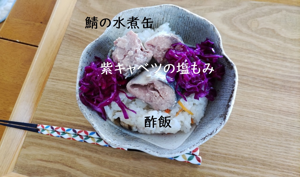 数日前に残り、冷凍しておいた「ちらし寿司用の酢飯」に、ずーーっと前に買った鯖の水煮缶。