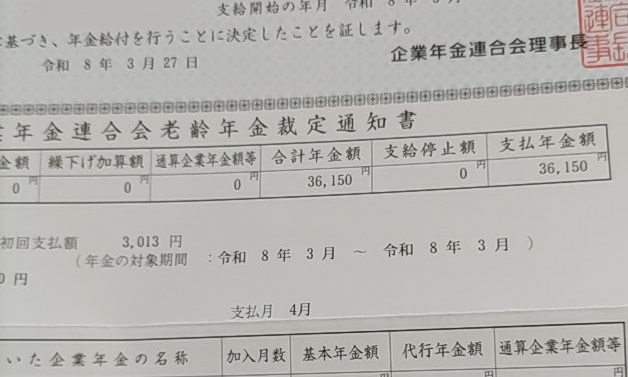 そしてやっと(約1カ月後)、企業年金裁定通知書が届いた。