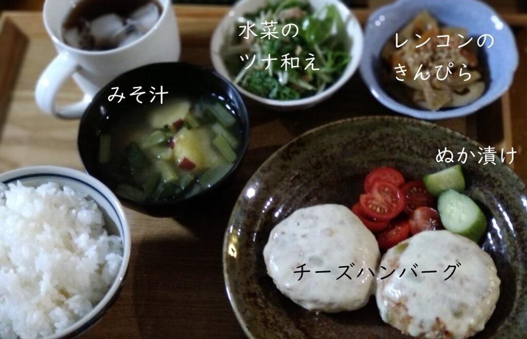 スライスチーズ1枚を半分に分けて、それを2つ折りにし、火を止めたハンバーグの上に押せ、蓋をして余熱で蒸らします。